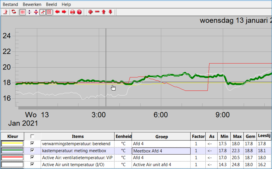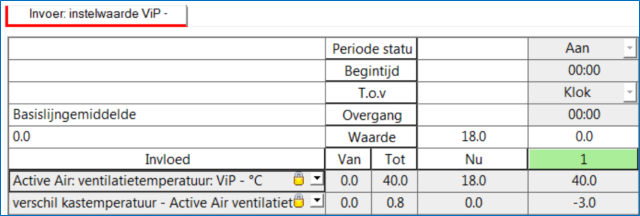 The solution is a control whereby the Active Air: ventilation temperature - temperature at which cold air is blown in - is barely higher than the (calculated) heating temperature. While cold air is blown in, the measured greenhouse temperature does not rise any further. See also the graph below; the measured greenhouse temperature is stable. The values (reading line, last column) show that the measured greenhouse temperature is almost equal to the Active Air: ventilation temperature and hardly higher than the calculated greenhouse temperature.